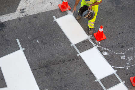 Workers are seen applying sealant to a dark asphalt road surface. They wear high-visibility vests and protective gear, suggesting a construction or repair project. The composition focuses on detail, with close-ups of tools and materials. Suitable for illustrating infrastructure, construction, or related commercial applications.