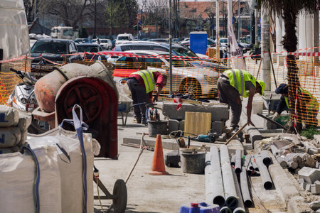 Thessaloniki, Greece - 02 April 2021: day view of manual labor workers with yellow vest on a street. Renovation of pavements and public infrastructure at the city center.