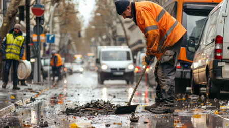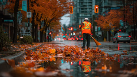 A dedicated urban street cleaner in a reflective safety vest sweeps vibrant autumn leaves on a rainy day, creating tranquil reflections in puddles.