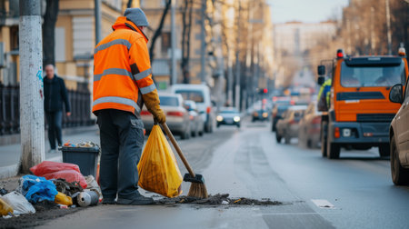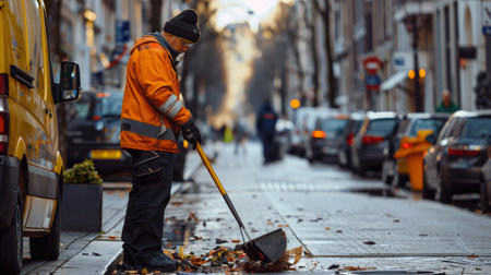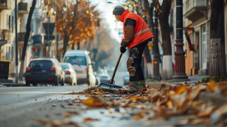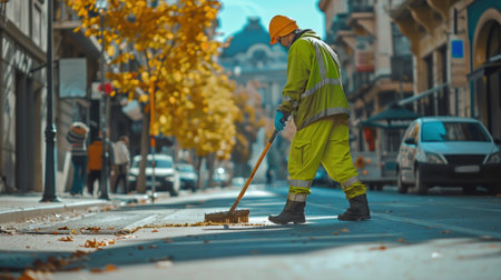 A street cleaner working in the city during autumn, showcasing urban maintenance and cleanliness in a bustling environment