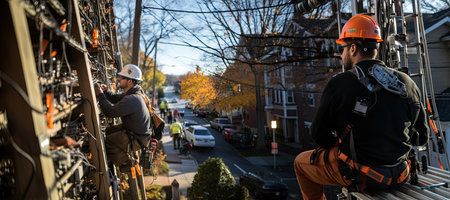 Workers are performing tasks at great heights on telephone poles, utilizing ropes for suspension. Generated with AI