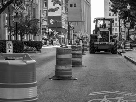Columbus, Ohio - August 3, 2019: Construction barrels for road work on a street in Columbus, Ohio on August 3, 2019.