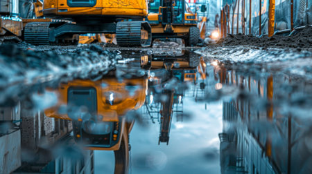 An artistic and moody shot of a construction site showing machinery with reflections in water pools during twilight.