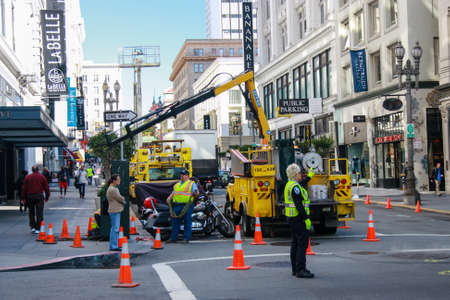 SAN FRANCISCO, US - SEPT 22, 2010: Municipal workers make city infrastructure service activity at downtown street in San Francisco on Sept 22, 2010.