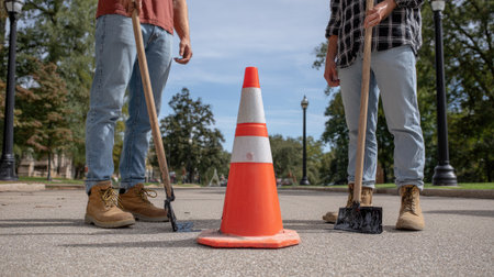 Two workers stand on a paved surface, flanking an orange and white traffic cone. They hold tools with wooden handles. The image presents a daytime scene with natural light. The composition focuses on the central cone. It can be used for various commercial projects related to construction and infrastructure.