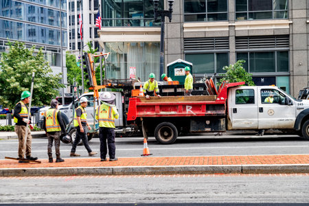 Road pavement repair in Washington, DC. Trucks unload equipment and guardrails onto the road.