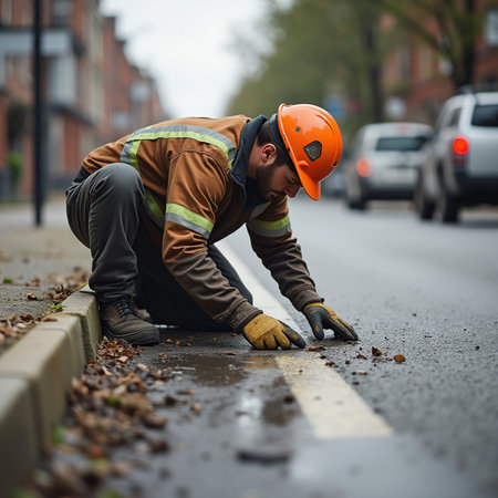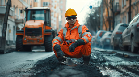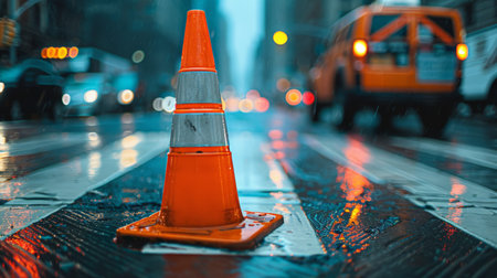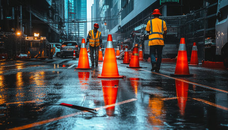 A dedicated worker repairs the road while bright orange traffic cones ensure safety in the bustling city. Generative AI