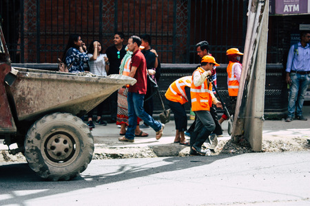 Kathmandu Nepal August 26, 2018 View of unknowns Nepali worker cleaning the street at Thamel district in Kathmandu in the afternoon
