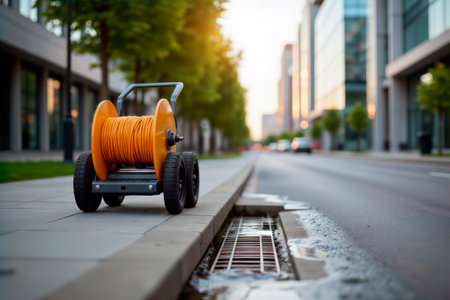 Orange cable reel cart on urban sidewalk with modern architecture backdrop.