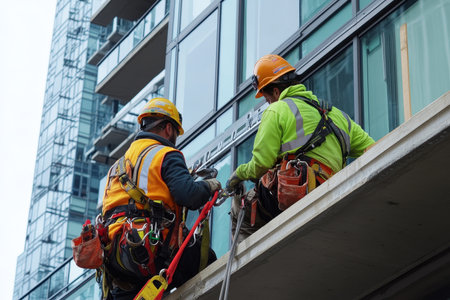 Construction workers in safety gear using fall arrest devices on elevated roof structure for safety