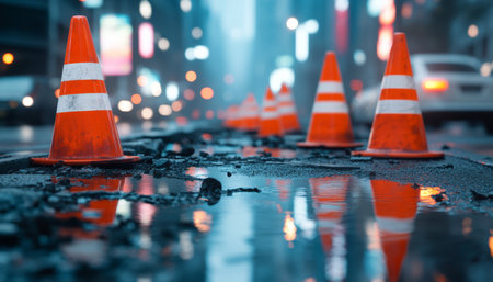 A detailed urban scene of a city street under construction with reflective traffic cones and puddles