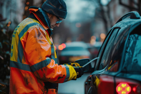 Uk Traffic Warden Issuing A Parking Ticket In A Closeup Shot. Сoncept Traffic Wardens On Duty, Parking Enforcement, Closeup Ticketing, UK Parking Regulations.