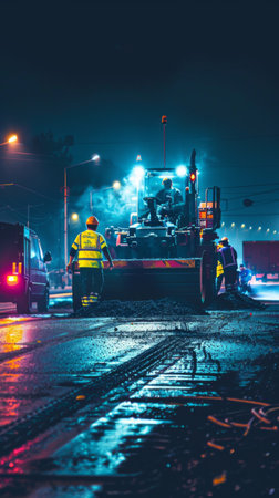 Construction workers are busy repairing the road at night, illuminated by vivid lights. The atmosphere is dynamic with heavy machinery at work, showcasing a blend of labor and technology.