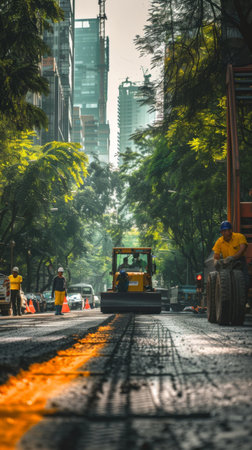 Workers make improvements to a city street, using heavy machinery and tools, while trees provide a vibrant green contrast to the asphalt