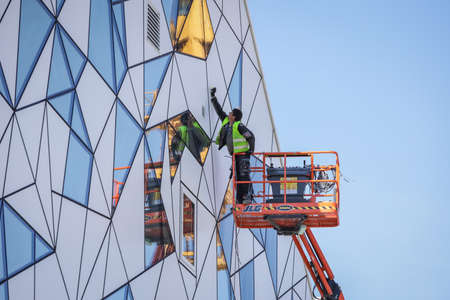Construction worker on mobile boom lift cleaning external rainscreen cladding on new build office and warehouse development