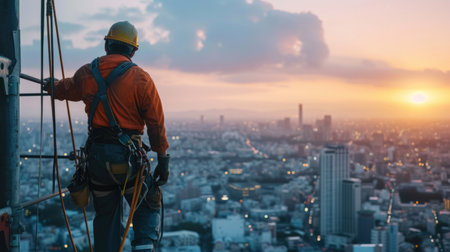 A worker in safety gear performs maintenance on a tall building at sunrise, overlooking a city.