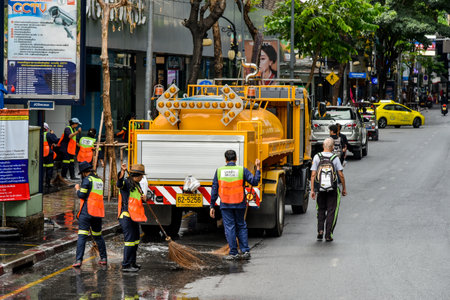 BANGKOK, THAILAND - 15 DEC : District staff worker cleaning footpath on 15 December 2018 in Silon road, Bangkok, Thailand