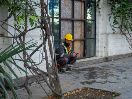 Batumi, Georgia. 29/10/2022 The builder sits and rests. The worker sits with a smartphone. Lunch break. A person with a profession.