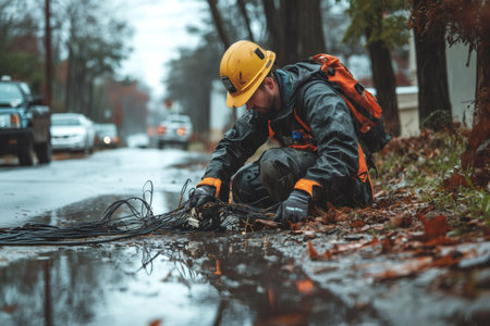 Electrician wearing safety helmet and waterproof clothing repairing damaged outdoor wiring on a rainy day
