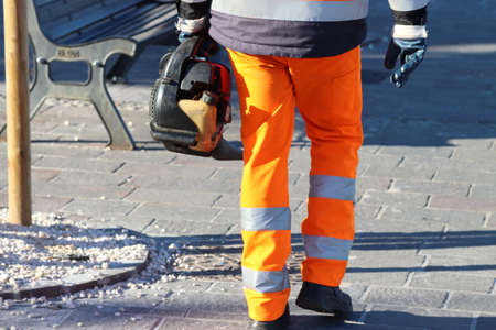 Handsome man in yellow uniform picking up fallen leaves on the street