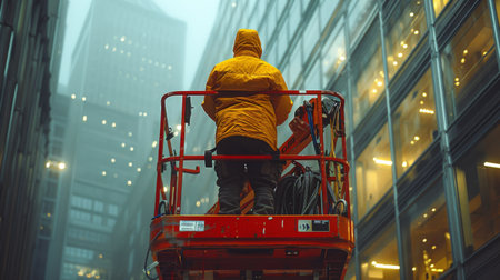 A worker, wearing a bright yellow jacket, stands in a red lift platform, looking out over the city skyline. The worker is cleaning windows on a skyscraper, which is shrouded in fog. The image shows a bustling urban environment and the hard work involved in maintaining a citys infrastructure.