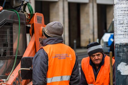 Workers in overalls in an autumn morning getting ready to work on the main boulevard Victoriei (Calea Victoriei) in downtown Bucharest, Romania, 2019