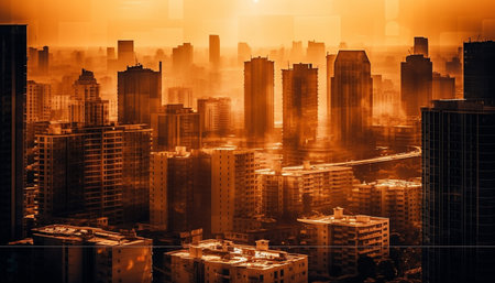 A breathtaking aerial view of a vibrant cityscape at sunset, with reflective skyscrapers and busy streets illuminating the scene as the sun sets on the horizon.