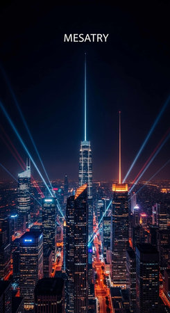 A stunning nighttime cityscape showcases illuminated skyscrapers and glimmering reflections in glass buildings. This vibrant winter scene captures urban beauty and energy.