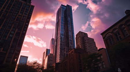 Captivating view of glass skyscrapers reflecting a stunning sunset filled with vibrant colors, showcasing modern architecture and urban beauty.