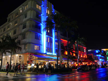 Miami, Florida- December 2018: Night shot with crowds walking or eating in restaurants at Ocean Drive, Miami.