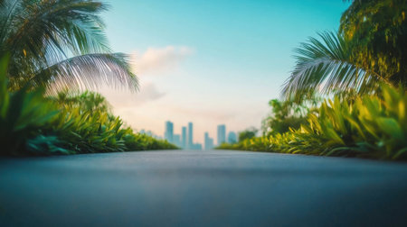 A tranquil urban pathway invites exploration, framed by vibrant greenery and palm trees, leading towards a soft-focused city skyline under a sunny sky.