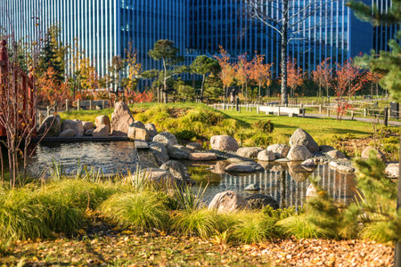A serene autumn urban park with a small pond surrounded by rocks and greenery. Concept: the integration of nature within an urban environment