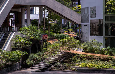 Bangkok, Thailand - Apr 16, 2021 : Concrete staircase and surrounding green trees in step path way park in department store. No focus, specifically.
