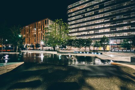 Pool and modern buildings at night, in downtown Washington, DC.