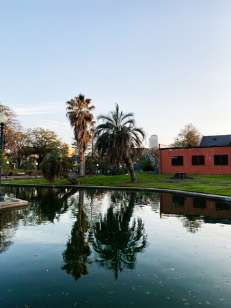 Serene cityscape reflected in a tranquil park pond