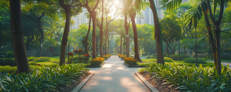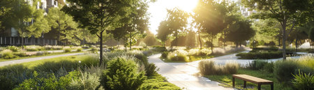 A Sunlight filters through a modern urban park, highlighting the meticulous green landscaping and peaceful environment.