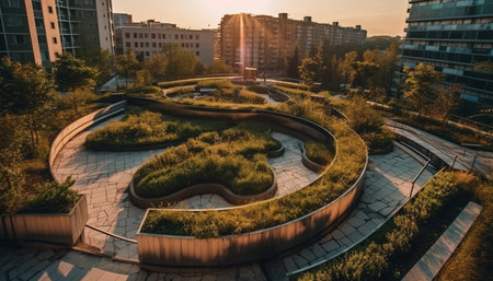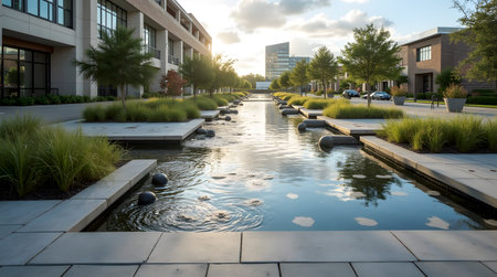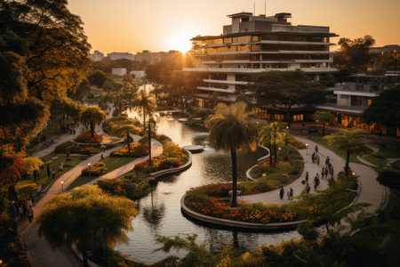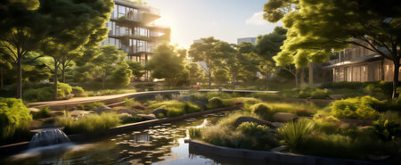Sustainable urban park design featuring lush landscapes and serene water features during golden hour