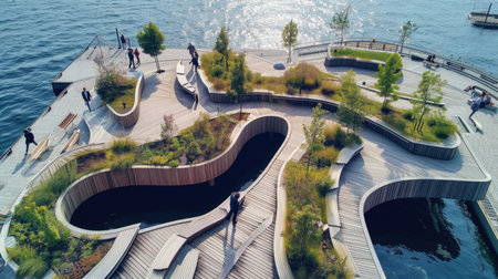 Modern wooden waterfront concept, organic shapes, biodegradable materials, trees and benches.
