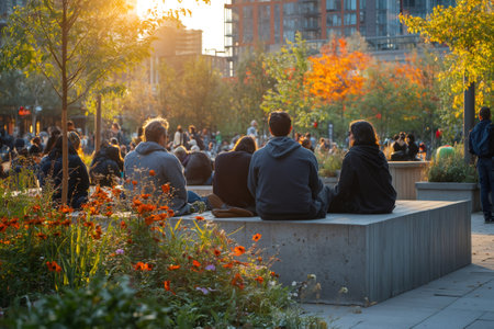 People enjoying golden hour sunset in an urban park, sitting on a concrete ledge surrounded by flowers and greenery