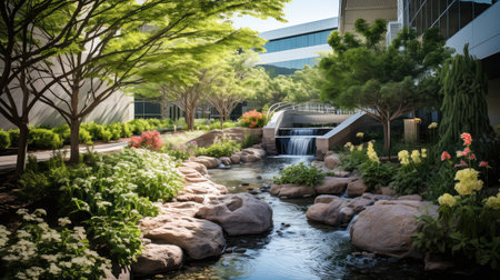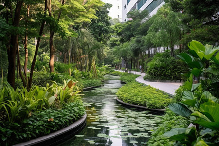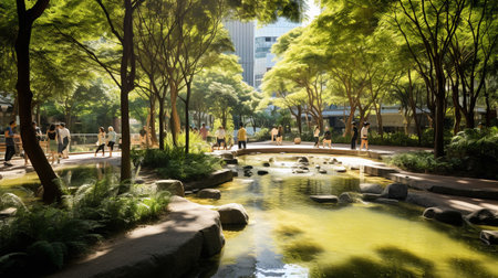 A photo of an urban park oasis with clean air, greenery, and fresh water features