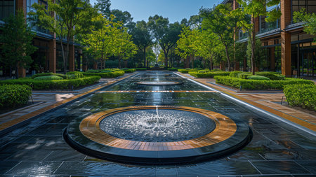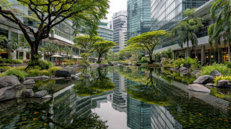 A captivating urban scene featuring a serene water feature surrounded by modern buildings, lush greenery, and tranquil reflections, offering a peaceful escape.