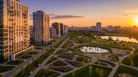 A modern urban park with geometric garden beds, pathways, and a lake, framed by contemporary apartment buildings at...