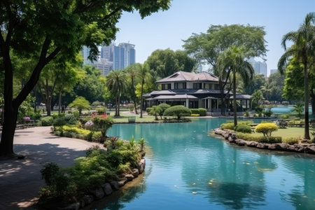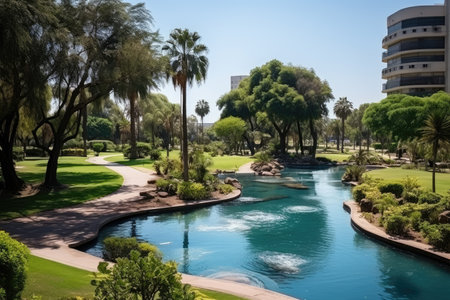 Tranquility in Al Bidda Park, Doha lush nature and serene lakes., generative AI