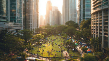 Blurred background of a serene urban park nestled between tall buildings, filled with people enjoying outdoor activities under the warm sunlight at sunset. a vibrant escape in the city.