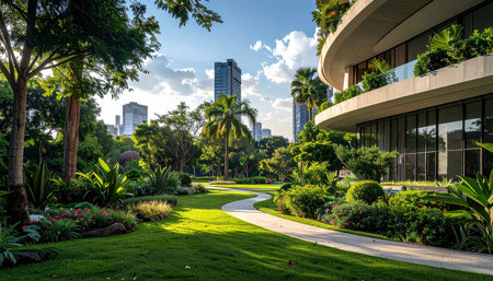 This scenic image captures a vibrant urban garden surrounded by modern architecture, showcasing a lush pathway and a dramatic cloudy sky, perfect for city life appreciation.