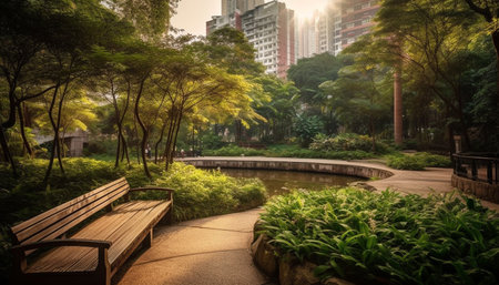 Tranquil scene of a green forest with a footpath and bench generated by artificial intelligence