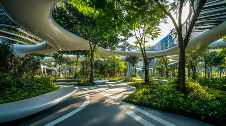 A beautifully designed urban park featuring modern structures and abundant greenery, perfect for relaxation