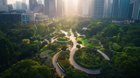 Aerial view of a meticulously designed urban park with walking paths, trees, and water features