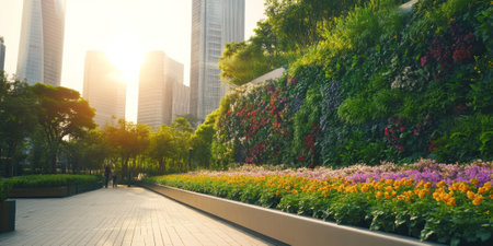 A futuristic city park with towering vertical gardens, sleek walkways, and vibrant flower beds. The setting combines nature with modern design, showing a harmonious urban environment.