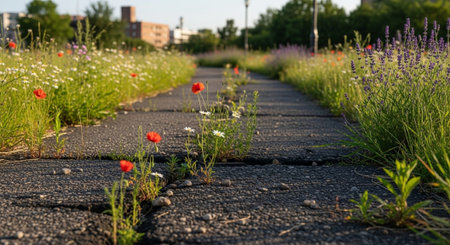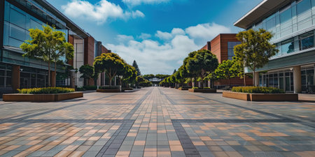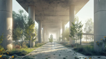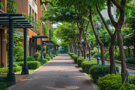 A sunlit urban pathway gently curves through vibrant foliage, with sleek contemporary structures rising in the distance under a clear, blue sky.